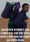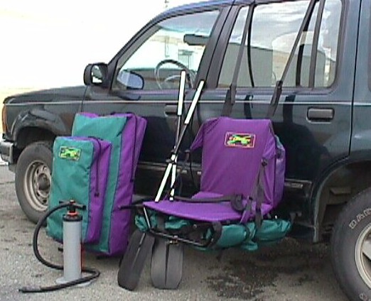 Backpack inside the bag with the boat, paddle, pump and gear.